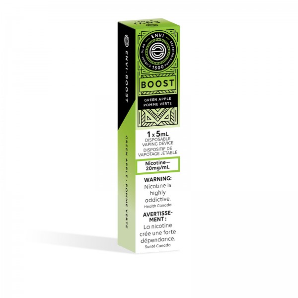 DescriptionGreen Apple ENVI Boost Disposable Vape are crisp granny smith apples filled into a 5mL closed vape. Capable of up to 1500 tasty puffs and equipped with an all-new anti-slip technology provi..